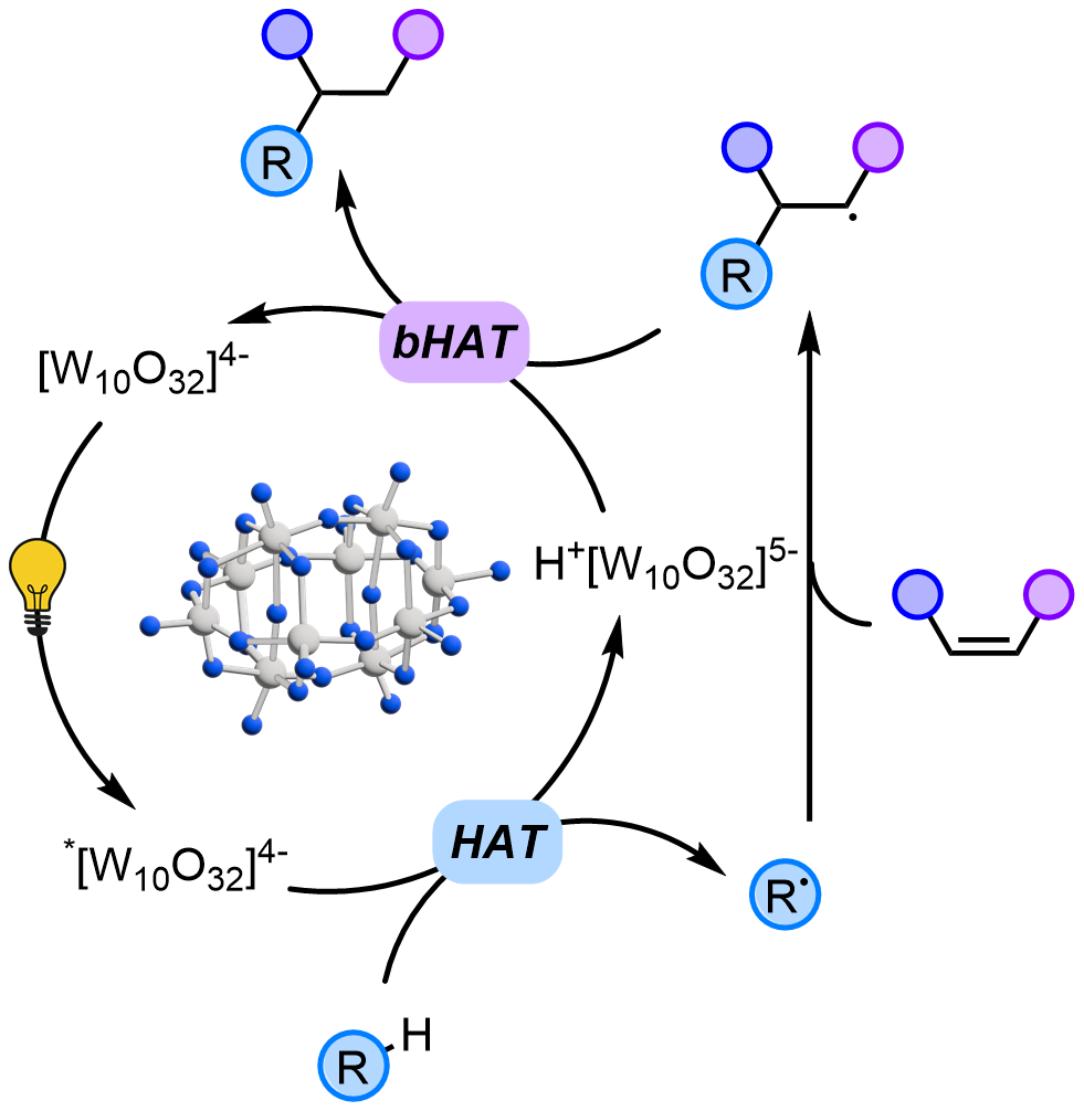 Recently, our research group has focused its attention on TBADT (tetrabutylammonium decatungstate). This compound (a white powder) is able to activate the C-H bonds in various molecules by homolytic cleavage of this bond (see the Scheme below) and allows for the generation of radicals (R•) under very mild conditions. The latter intermediate is then trapped by electron-poor olefins (α,β-unsaturated esters, ketones or nitriles) resulting in an overall radical conjugate addition onto a C=C double bond.